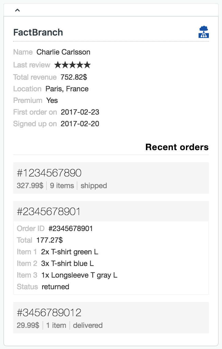 FactBranch looks up the customer in your database and shows your agents fresh data whenever they open a ticket in Zendesk.